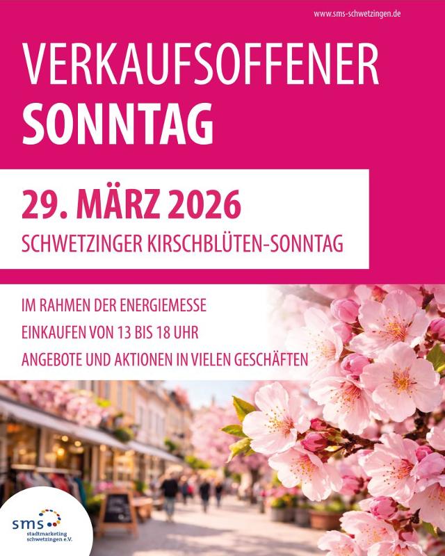 Am Sonntag, 29. März 2026, verwandelt sich die Schwetzinger Innenstadt wieder in ein blühendes Frühlingsparadies. Zum verkaufsoffenen Kirschblütensonntag, der im Rahmen der Energiemesse stattfindet, laden die Geschäfte von 13 bis 18 Uhr zum Bummeln und Stöbern ein, mit Angeboten und Aktionen in vielen Geschäften. Neben Einkaufen erwarten die Besucher leckere Cocktails und ein stimmungsvolles Ambiente. Passend zur beginnenden Kirschblütenzeit rund um das Schloss Schwetzingen erstrahlt die Innenstadt im Zeichen der Blüten.